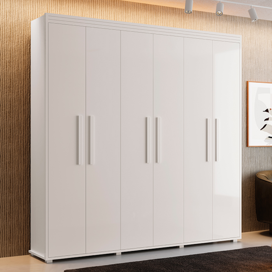 Este guarda-roupa 100% MDF combina elegância e resistência, apresentando base e laterais reforçadas de 20 mm e pés em madeira. O móvel oferece alta funcionalidade com cabideiros em alumínio, gavetas com corrediças telescópicas e fundo encaixado com pinázio, garantindo um acabamento robusto e durável para o ambiente.