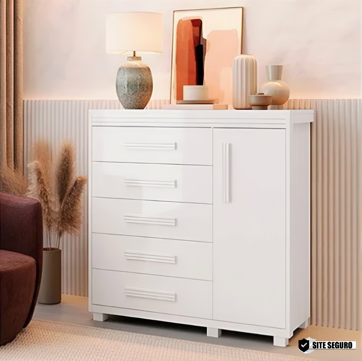 A Cômoda Londres 100% MDF da Barreto Lonçarcci é uma peça moderna que combina design sofisticado e funcionalidade. Com cinco gavetas embutidas, que conferem um visual de móveis planejados, e uma porta com puxadores em MDF, oferece amplo espaço de armazenamento. Sua estrutura robusta inclui tampo de 20 mm, pés em madeira e reforço no fundo das gavetas, garantindo durabilidade. O acabamento texturizado com sete camadas de tinta proporciona resistência a riscos e batidas, além de um toque refinado. As corrediças telescópicas asseguram o deslizamento suave das gavetas, tornando-a uma escolha prática e elegante para o seu quarto.