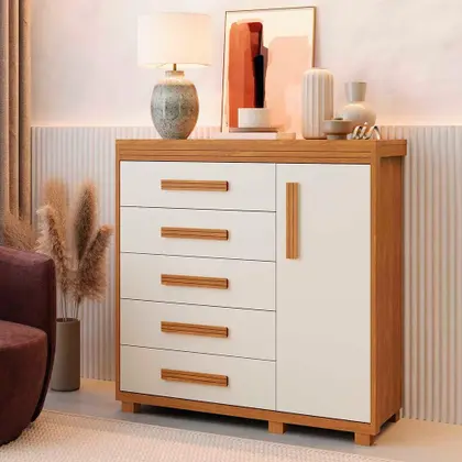A Cômoda Londres 100% MDF da Barreto Lonçarcci é uma peça moderna que combina design sofisticado e funcionalidade. Com cinco gavetas embutidas, que conferem um visual de móveis planejados, e uma porta com puxadores em MDF, oferece amplo espaço de armazenamento. Sua estrutura robusta inclui tampo de 20 mm, pés em madeira e reforço no fundo das gavetas, garantindo durabilidade. O acabamento texturizado com sete camadas de tinta proporciona resistência a riscos e batidas, além de um toque refinado. As corrediças telescópicas asseguram o deslizamento suave das gavetas, tornando-a uma escolha prática e elegante para o seu quarto.