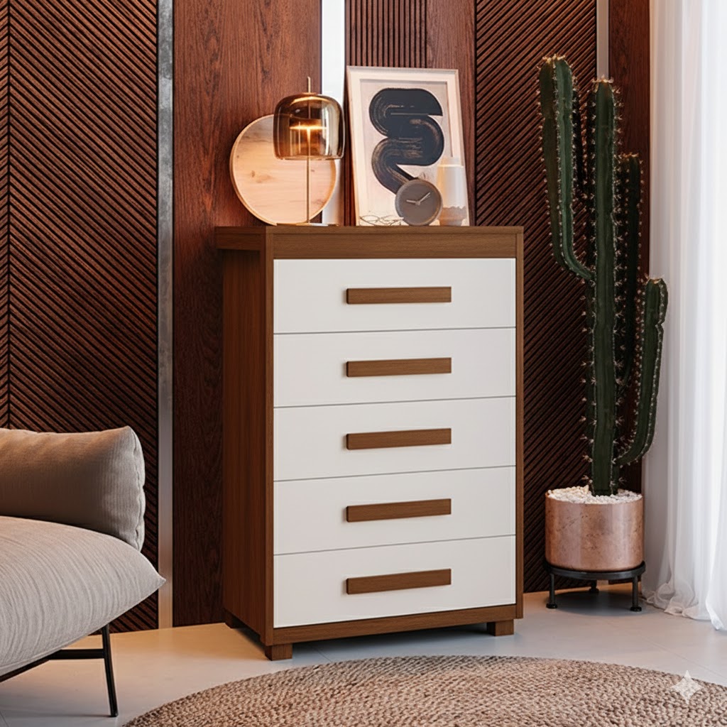 A Cômoda Paris 100% MDF da Barreto Lonçarcci é a escolha ideal para quem busca aliar sofisticação e funcionalidade no ambiente. Com design moderno e acabamento refinado, ela possui cinco gavetas equipadas com corrediças telescópicas, garantindo um deslizamento suave e prático. Os puxadores em MDF e o tampo de 20 mm conferem um toque de elegância, enquanto os pés em madeira asseguram estabilidade. Além disso, o reforço no fundo das gavetas e o encabeçamento de 20 mm nas laterais e base proporcionam maior durabilidade.