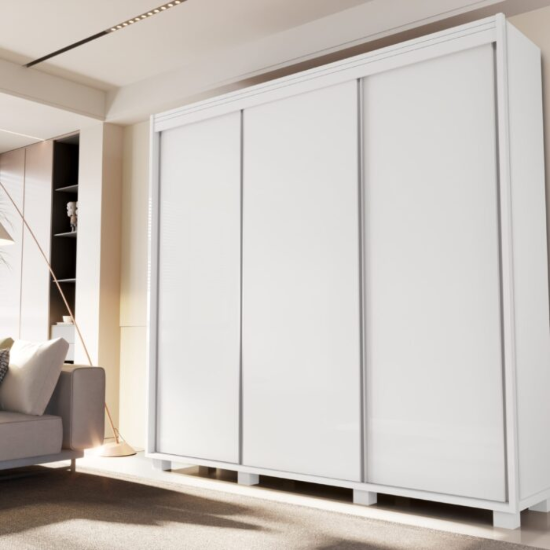 Este guarda-roupa une resistência e sofisticação em um móvel fabricado inteiramente em MDF de alta qualidade. Com estrutura reforçada por uma base de 25 mm e pés em madeira, ele oferece estabilidade superior, enquanto os detalhes em alumínio no cabideiro e no trilho garantem durabilidade e um deslizamento suave. O acabamento refinado com encabeçamento de 25 mm nas laterais e a praticidade das gavetas com corrediças telescópicas completam este móvel, tornando-o a escolha ideal para quem busca organização e elegância para o quarto.
