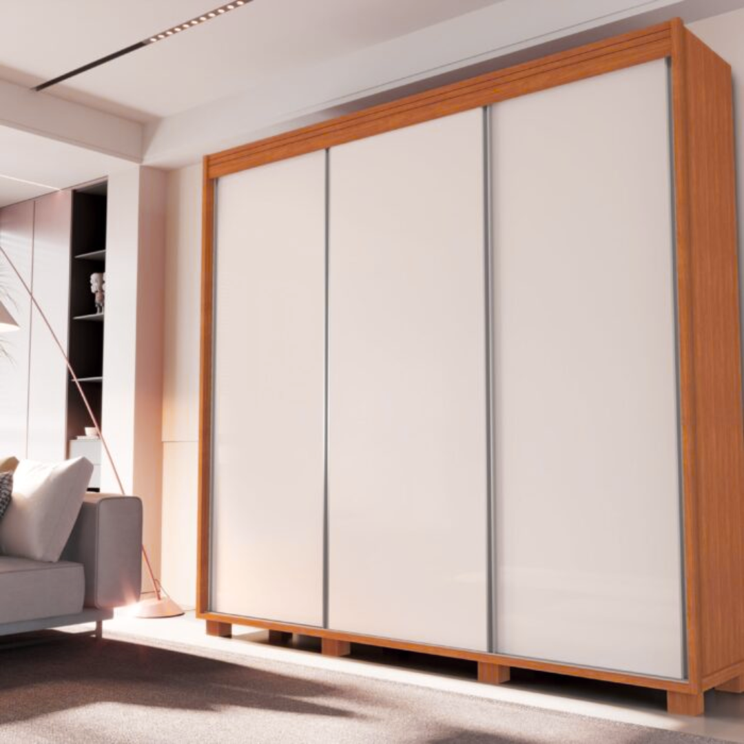 Este guarda-roupa une resistência e sofisticação em um móvel fabricado inteiramente em MDF de alta qualidade. Com estrutura reforçada por uma base de 25 mm e pés em madeira, ele oferece estabilidade superior, enquanto os detalhes em alumínio no cabideiro e no trilho garantem durabilidade e um deslizamento suave. O acabamento refinado com encabeçamento de 25 mm nas laterais e a praticidade das gavetas com corrediças telescópicas completam este móvel, tornando-o a escolha ideal para quem busca organização e elegância para o quarto.