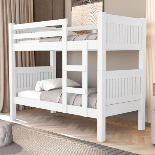 Beliche versátil com cabeceiras 100% mdf e estrado reforçado contendo 10 sarrafos de madeira de 45mm e 10 ripas em mdf apresentando pés com protetor de umidade e grade protetora superior com escada fixada por parafusos passantes e porca para total segurança além de permitir o uso como duas camas independentes garantindo maior praticidade e aproveitamento de espaço no ambiente.