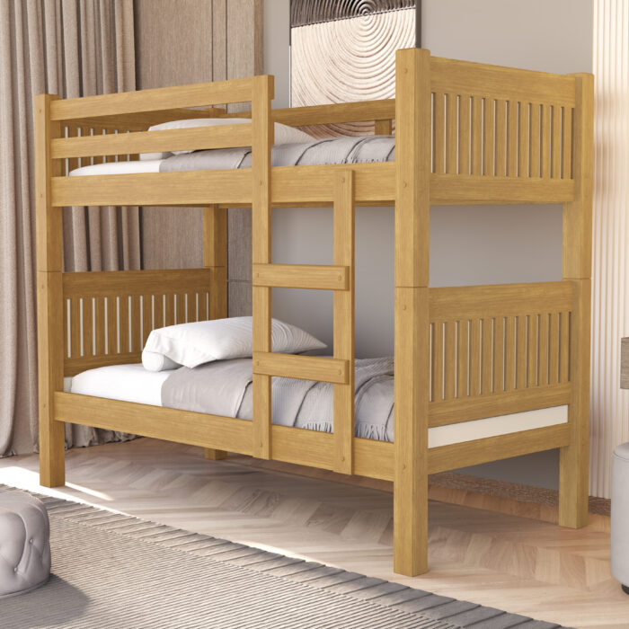 Beliche versátil com cabeceiras 100% mdf e estrado reforçado contendo 10 sarrafos de madeira de 45mm e 10 ripas em mdf apresentando pés com protetor de umidade e grade protetora superior com escada fixada por parafusos passantes e porca para total segurança além de permitir o uso como duas camas independentes garantindo maior praticidade e aproveitamento de espaço no ambiente.