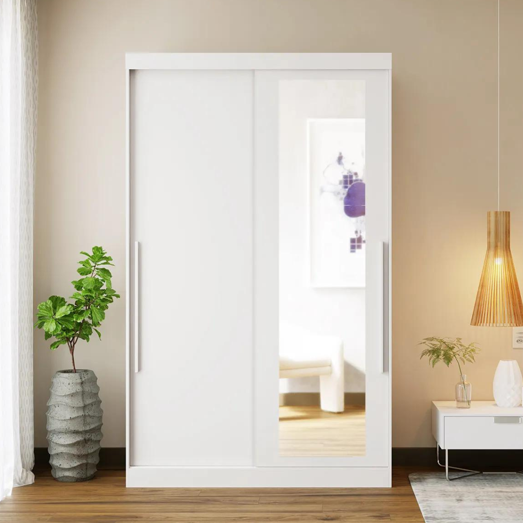 Os guarda-roupas da Batrol Móveis apresentam um acabamento de alta qualidade com materiais que garantem encaixes suaves e um design sofisticado para o ambiente. Sua estrutura é fabricada em MDP com chapas homogêneas e resistentes que facilitam o processo de montagem no dia a dia. Entre os principais detalhes técnicos deste produto estão o cabideiro metálico em formato oblongo, as corrediças metálicas para um deslize eficiente, as dobradiças de pressão que asseguram o fechamento das portas e os elegantes puxadores modelo Topázio feitos em MDF.