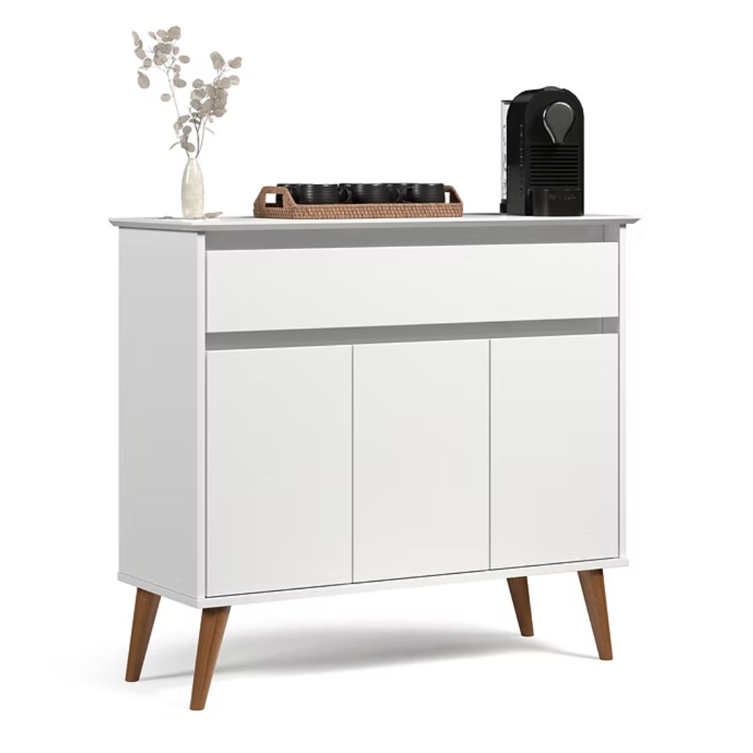 Este buffet aparador é a solução ideal para organizar sua sala com elegância, oferecendo amplo espaço interno para guardar louças e objetos. O móvel apresenta um design moderno e sofisticado, com tampo e portas em MDF usinados e um acabamento clean sem puxadores externos. Sua estrutura conta com pés em madeira que garantem resistência e estabilidade, conferindo um toque retrô que valoriza qualquer decoração.