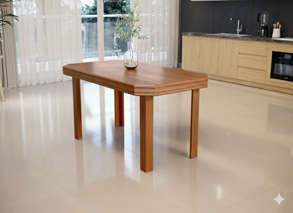 Esta mesa oferece alta resistência e um design moderno que valoriza qualquer ambiente. Sua estrutura geométrica robusta garante estabilidade total, unindo a durabilidade do material natural com uma estética contemporânea impecável para sua sala de jantar.
