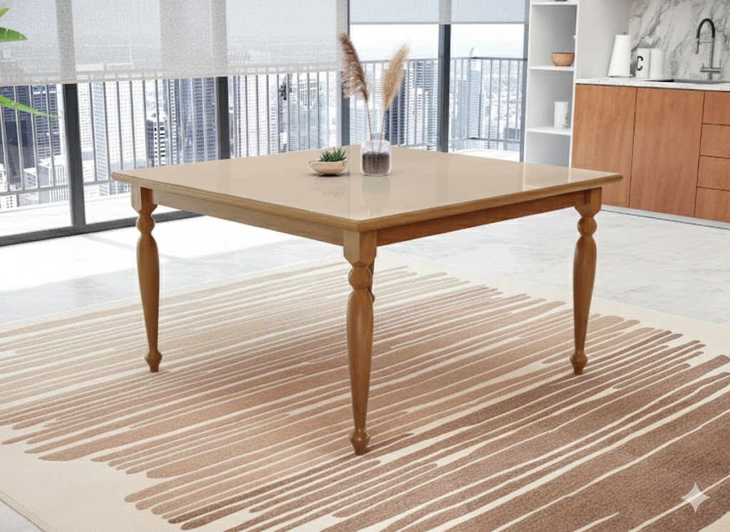 Esta mesa de jantar une a elegância do estilo clássico com a funcionalidade moderna, destacando-se pela estrutura de madeira que conferem um toque artesanal e sofisticado ao ambiente. Com um tampo de acabamento impecável, ela é a escolha perfeita para quem busca um móvel de presença que transforma a sala de jantar em um espaço acolhedor e cheio de personalidade.