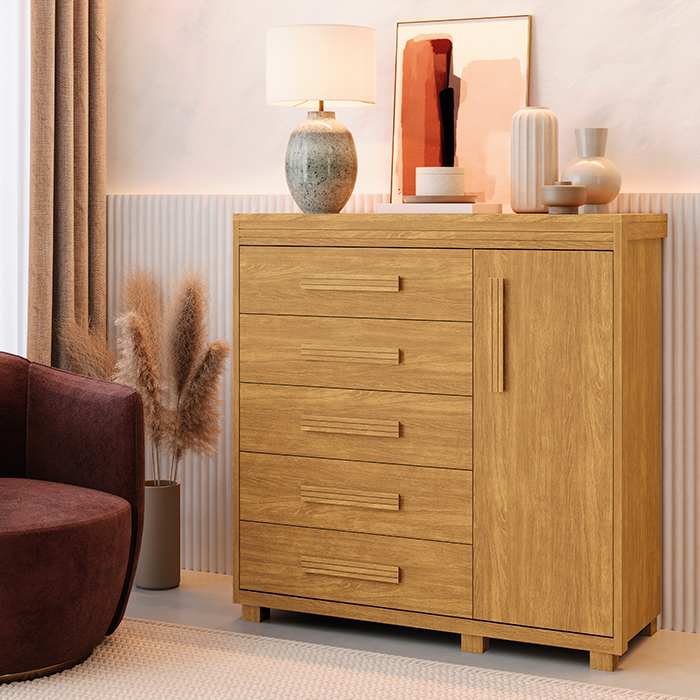 A Cômoda Londres 100% MDF da Barreto Lonçarcci é uma peça moderna que combina design sofisticado e funcionalidade. Com cinco gavetas embutidas, que conferem um visual de móveis planejados, e uma porta com puxadores em MDF, oferece amplo espaço de armazenamento. Sua estrutura robusta inclui tampo de 20 mm, pés em madeira e reforço no fundo das gavetas, garantindo durabilidade. O acabamento texturizado com sete camadas de tinta proporciona resistência a riscos e batidas, além de um toque refinado. As corrediças telescópicas asseguram o deslizamento suave das gavetas, tornando-a uma escolha prática e elegante para o seu quarto.