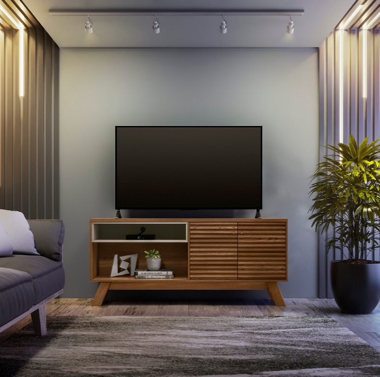 O Rack Camboriú é ideal para você que não abre mão da modernidade. Para Tvs de até 65 polegadas, conta com duas portas de abrir com detalhe ripado e espaços multifuncionais para aparelhos eletrônicos e objetos de decoração. Os pés em estilo retrô é o diferencial do Rack Camboriú, traz muito mais elegância para o seu ambiente.